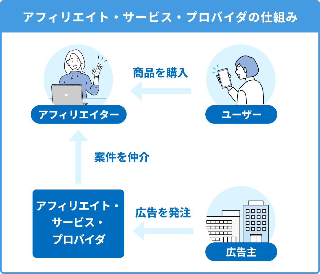 ASPとは「アフィリエイト・サービス・プロバイダ(Affiliate Service Provider)」の略で、広告主(企業)とアフィリエイター(広告を紹介する人)をつなぐ仲介業者のことです。