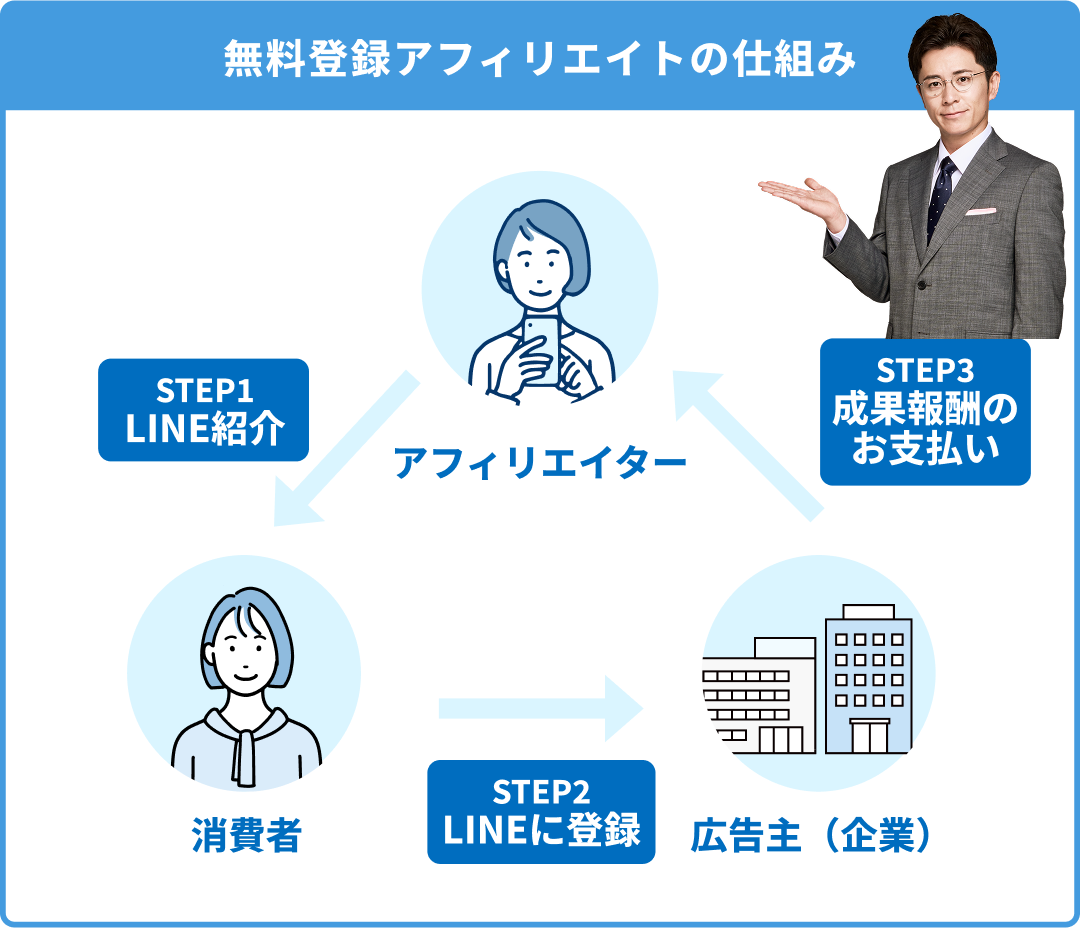 簡単にいうと、「商品を売りたい企業」と「商品を紹介して稼ぎたい人」をつなぐサービスです。