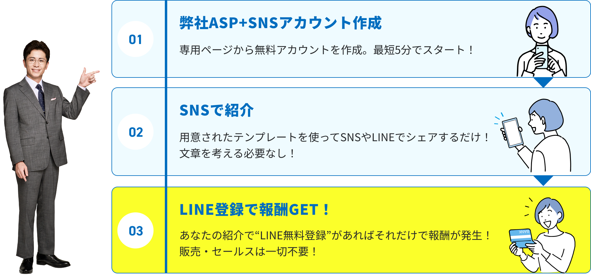 一般的なアフィリエイトが「商品を売って報酬を得る」のに対し、独立型ASPアフィリエイト「無料登録」だけで報酬が発生する新しい仕組みです。